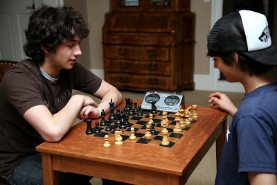 Later in the day the entire family drove out to Lancaster to watch Kyle (#5) in action. Here he wins a header (not exactly obvious from the photo) and together with teammate Ray totally dominate their defender. The boys dropped a 2 point lead in the last five minutes to settle for a tie. Despite the dissappointing outcome, Kyle had a nice assist.