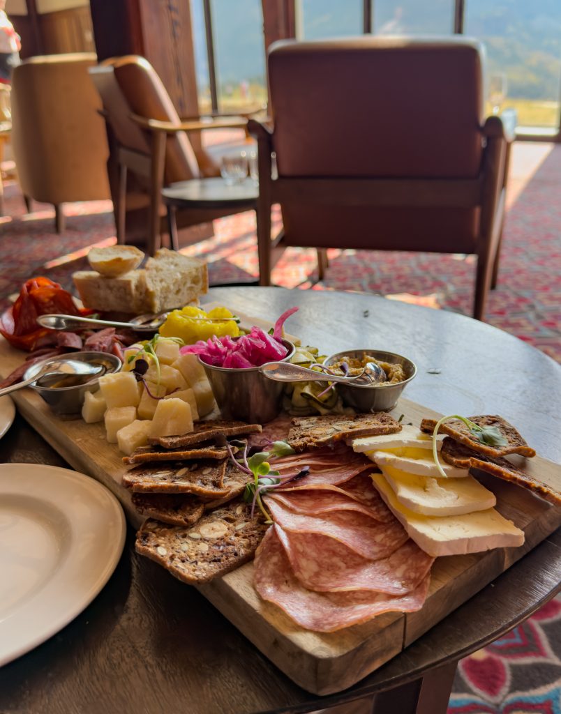 Not the best start to my 67th birthday. Fortunately, the rest of the day was wonderful. We drove three hours from Calgary to the Waterton Lakes National Park where we stayed at the Prince of Wales hotel. The hotel is a historic landmark perched on a bluff above Waterton townsite, offering sweeping views of Upper Waterton Lake and the surrounding Rocky Mountains. Opened in 1927, the hotel was built by the Great Northern Railway in a dramatic Swiss-chalet style, and has been designated a National Historic Site of Canada since 1992. We arrived shortly before noon and paused to enjoy a charcuterie board which was more like a full meal.