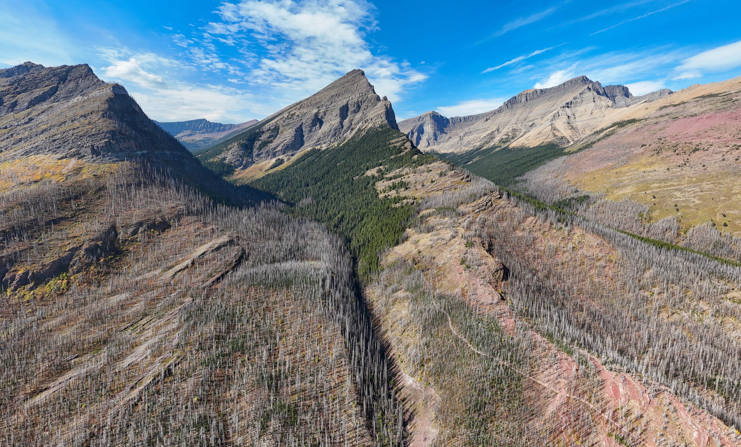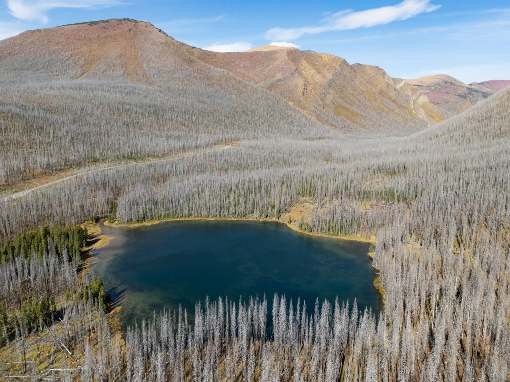 In 2017, the Kenow Wildfire, triggered by a lightning strike, consumed 100,000 acres, half of which was within the Waterton Lakes National Park boundary. The fire destroyed the visitor center, campground, staff housing, and much of the hiking trail network, while forcing full evacuation of the Waterton townsite. Although major infrastructure was lost, proactive firefighting measures saved the Prince of Wales Hotel and mitigated even greater damage to the town itself. It may not be apparent at first glance, but all of the trees in the photo below, save a few dozen in the lower left corner were killed in the fire.