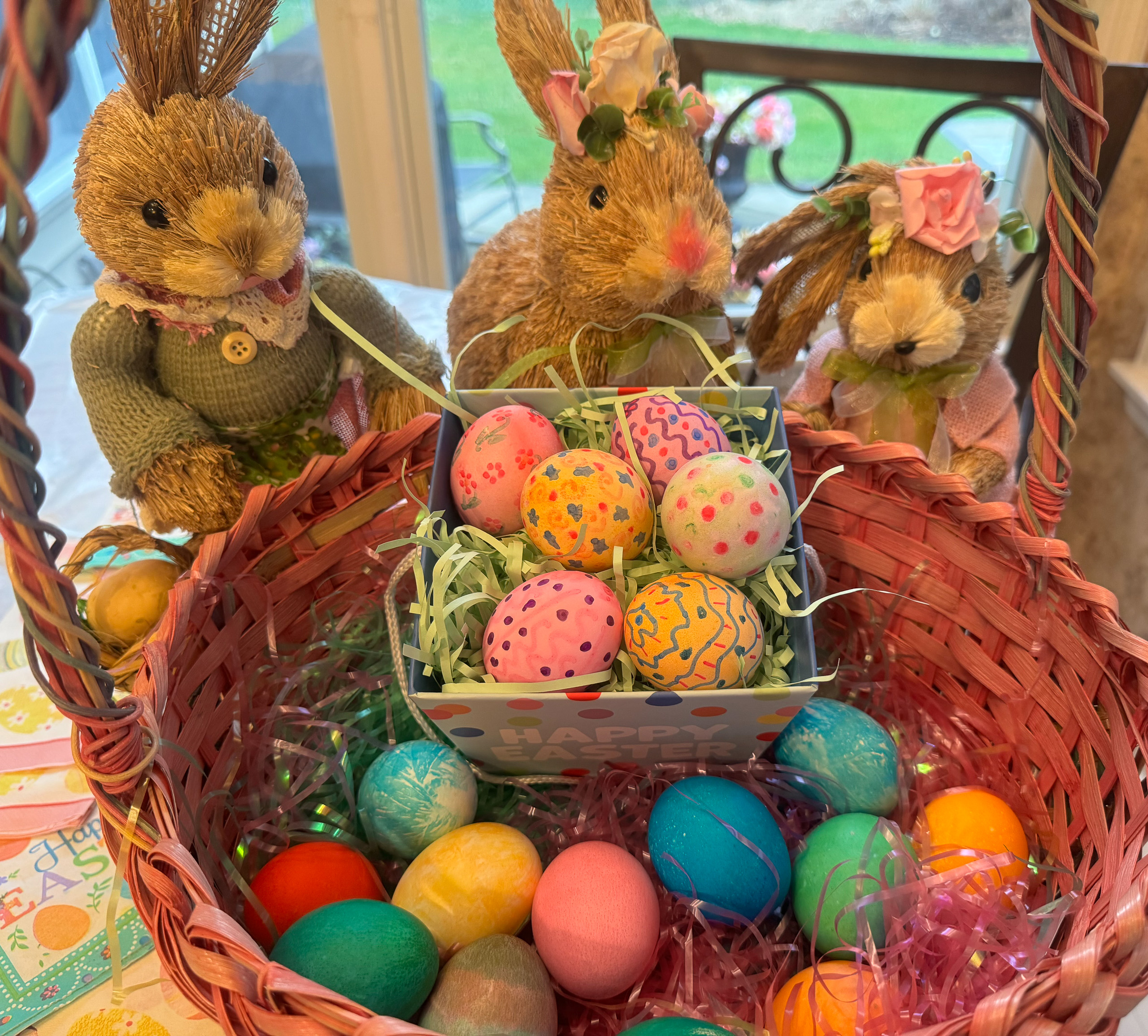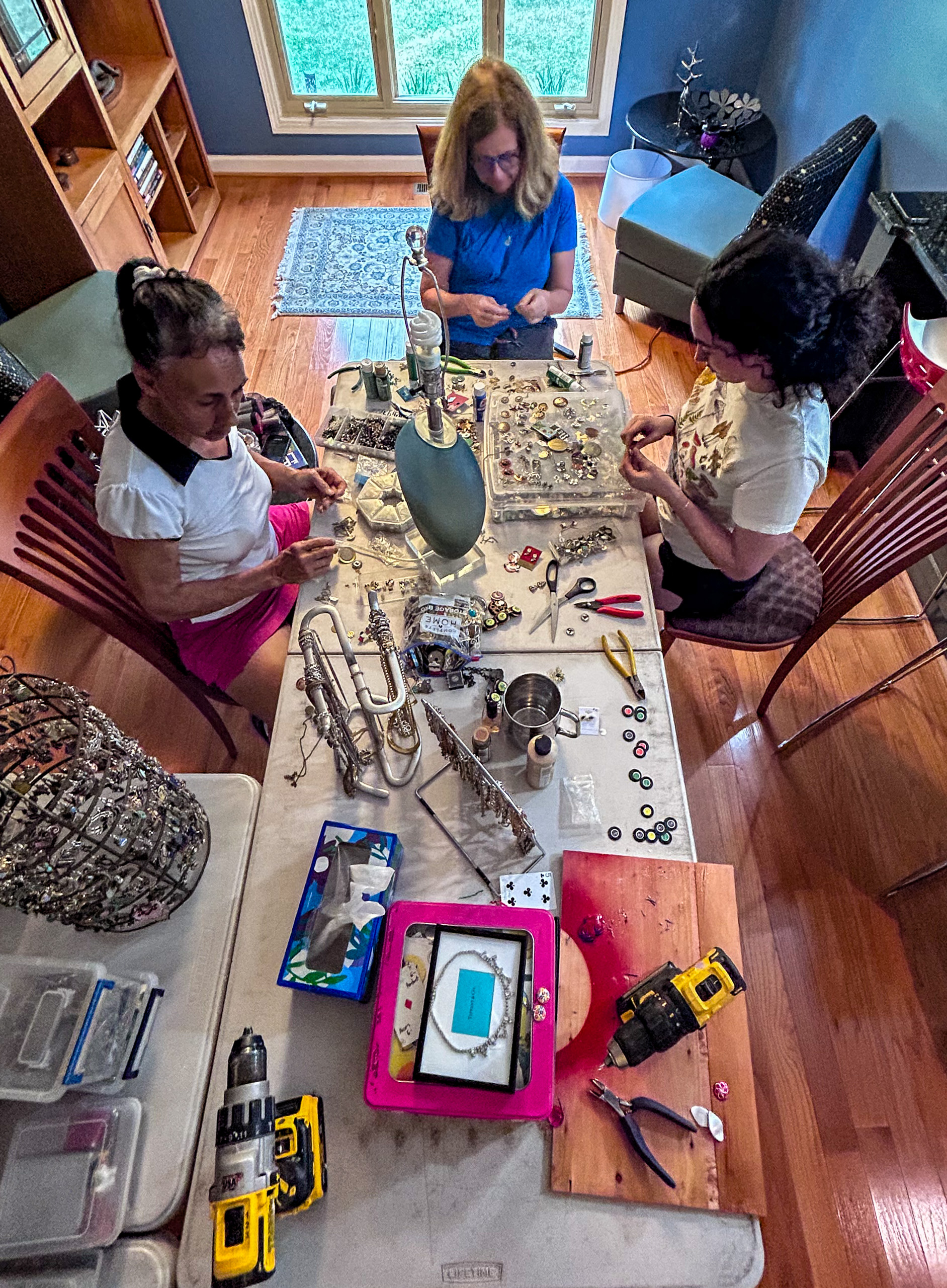 Among other endeavors, my sister Mayela, fashions jewelry from trinkets and baubles she finds at flea markets and sells the finished pieces. Jeanine and Maya have been looking forward to doing some of this work with her, and they seem to be in the thick of it. My other sister, Alissa, shared the photo below of her efforts at egg painting and Easter decoration.