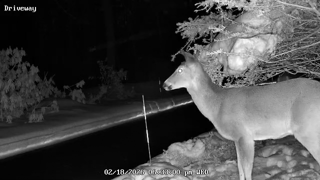 Most evenings, just after dusk, our driveway sensor chimes. When no visitors or deliveries appeared responsible for the alert, we eventually figured out that it was being triggered by members of our local deer herd. Pictured here is one of three that visited last night, as captured by one of our security cameras.