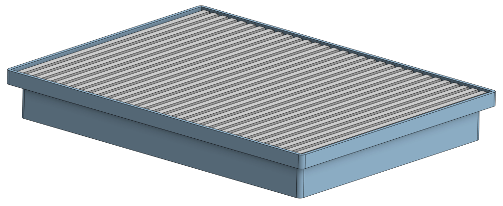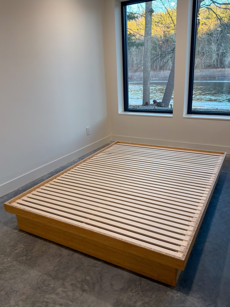 I completed the bed platform I started building last week today. I added horizontal slats, which serve two functions. The spacing allows the mattress to “breathe” while the 1/2″ thickness permits them to flex, adding a modest amount of give to the foundation. The slats are floating to allow them to bend. Fixed spacers provide permanent alignment. I can’t wait to test the feel of our mattress on the new frame. If it needs to be firmer, I can replace the slats with thicker ones, and should it be too firm, with thinner ones. I will probably need to wax the slat support surfaces to prevent squeaking during vigorous activity on the mattress. I am looking forward to that aspect of testing.