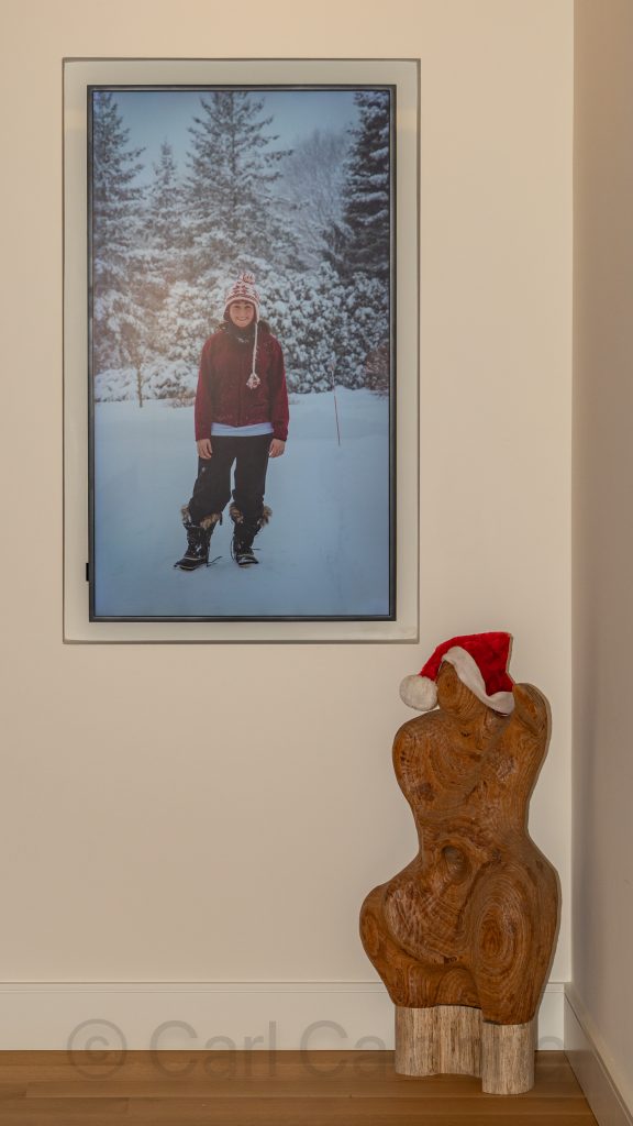 Of the recent gatherings we have hosted, preparation for this one seemed easy by comparison. I steam-roasted a large turkey breast, and Jeanine added holiday decorations throughout the house. She called me to the front hallway to photograph our digital picture frame, which was displaying a picture of young Maya in a tasseled winter hat. This, only moments after she had placed a Santa Claus hat on one of my mother’s sculptures, creating an admittedly humorous juxtaposition.