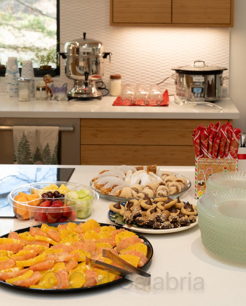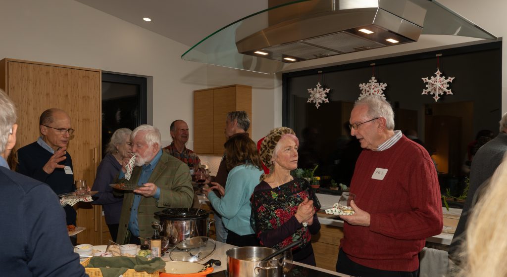 As part of a Conantum community tradition, we hosted a holiday potluck open house for our neighbors this evening for the second time in a row. Each year, ~10 residents host a party attended by ~20 neighbors. Our oldest guest was 90, and our youngest was 2. As always seems to be the case, most folks congregated in the kitchen area despite comfortable seating only steps away. Our kitchen was designed to handle multiple cooks, but the wide aisles also facilitate gathering around the island.