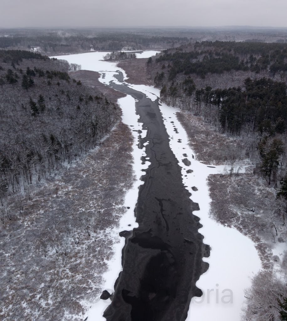 We were graced by about an inch of snow today. High winds prevented it from accumulating on tree limbs but it was happy to settle on the iced-over sections of the river and distant Fairhaven Bay. I opted to fly from the comfort of our living room (although it may be difficult to see me through the window) rather than venturing outdoors for a second time, the first to clear snow from the driveway.