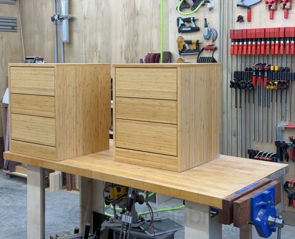 The pictured nightstands will serve as the base for a large bookshelf-style headboard to complement the platform bed I recently completed. I would have finished the project yesterday when the drawer slide hardware arrived if not for the fact that I had fabricated all 6 drawer boxes to the wrong depth. The nightstands are 18 inches deep, and that was the depth I used for the drawer boxes rather than the 15-inch depth of the drawer slides. Fortunately, I devised a rather clever way to slice 3 inches out of the drawers without compromising their integrity or appearance. Incidentally, these 6 drawers bring the total number I have built for our house to 120. I think I can safely say that we do not need any more and that these will be the last ones.