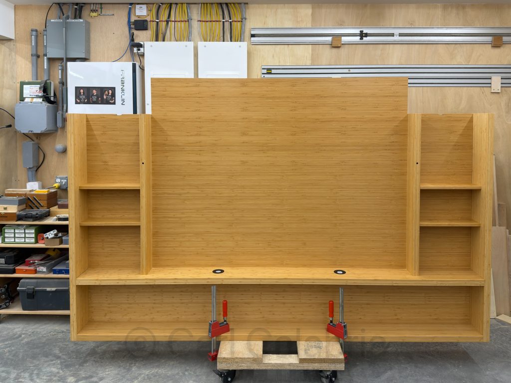Today, I completed the bookshelf headboard, the last component for our new bedroom suite. It is shown clamped upside down to a dolly, which has allowed me to move it around the shop. It is, no doubt, the largest piece of furniture I have ever built, and the main construction challenge has been dealing with the weight of over 200 pounds while working alone. When the kids visit next weekend, I will enlist their help to move this behemoth from my shop to our main bedroom and set it on the nightstands that will support it. All that remains to be done is to connect the built-in reading lights to their respective controls and power supply.