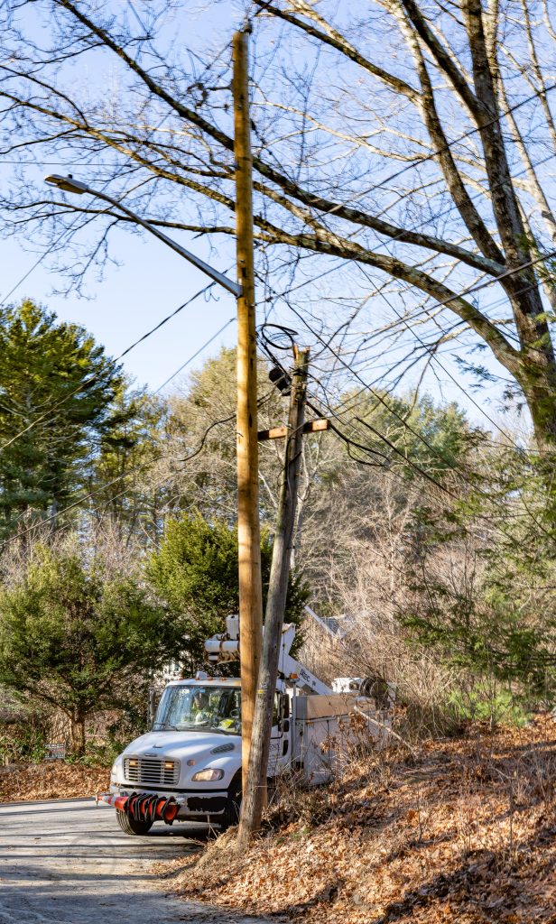 High winds today brought down trees and power lines throughout Concord. I had to take a significant detour while returning from a consulting gig as the main road through downtown was completely blocked. When I arrived, the power was out in our neighborhood, but not at our house, where our backup battery system was online. As is always the case, our municipal power company had electrical service restored in short order, just over twenty minutes. The story was not as rosy for our fiber optic broadband service, which was out of commission for more than 30 hours after the top of a utility pole snapped off (pictured above). The repair required a new pole and the replacement of 700 feet of 96-strand fiber.