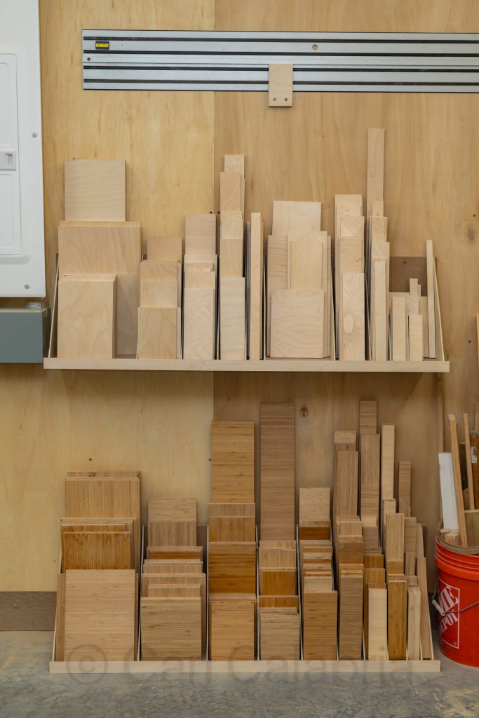 It is virtually impossible for me to part with even the smallest scraps of wood. I know that I will eventually find a use for each and every piece. The problem is how to store them in the meantime. Today, I began to address that challenge by constructing two racks to store plywood remnants, sorted by width to make finding the right piece easy. In the coming days or weeks, I hope to do the same for my solid wood off cuts.