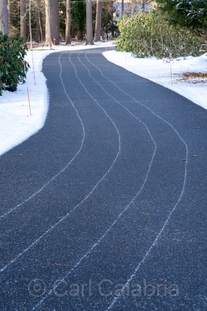 Our entire neighborhood was covered with a thin layer of ice this morning, making for treacherous walking and driving conditions. Nevertheless, tomorrow is trash collection day, and it was necessary to roll our garbage and recycling bins out to the street. Laden with holiday packaging and other waste, the wheels left distinctive tracks in the black ice, making for what I deemed an interesting photo.