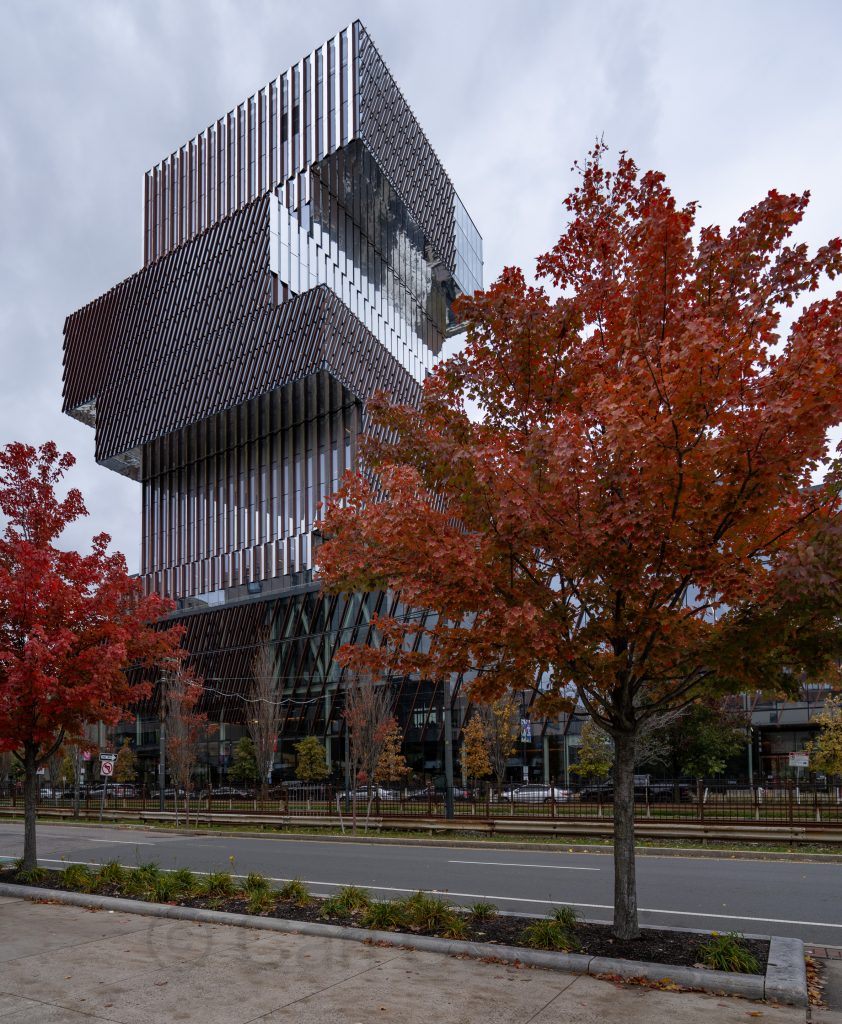 The Boston University Pumpkin Drop is an annual Halloween tradition hosted by the physics department, where dozens of pumpkins are hurled from the roof of the Metcalf Science Center. The event serves as a festive, messy lesson in physics concepts, including gravitation, velocity, and energy transition, as the pumpkins filled with various gooey substances fall 70 feet to the plaza below. When I heard about this event on the radio this morning, I decided I had to drive into Boston to witness it for myself. While in the area, I enjoyed photographing the Center for Computing & Data Sciences, also known by the nickname “the Jenga building” due to its unique stack-of-books architectural design.