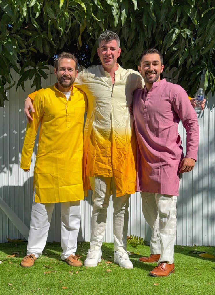 Kyle shared this photo, taken in Miami with friends from high school who are there to attend the multi-day wedding of their classmate Dave Lishanski. His bride’s family is from India, where celebrations involve vibrant attire, extensive food, music, and dance, with specific ceremonies varying by region and religion.