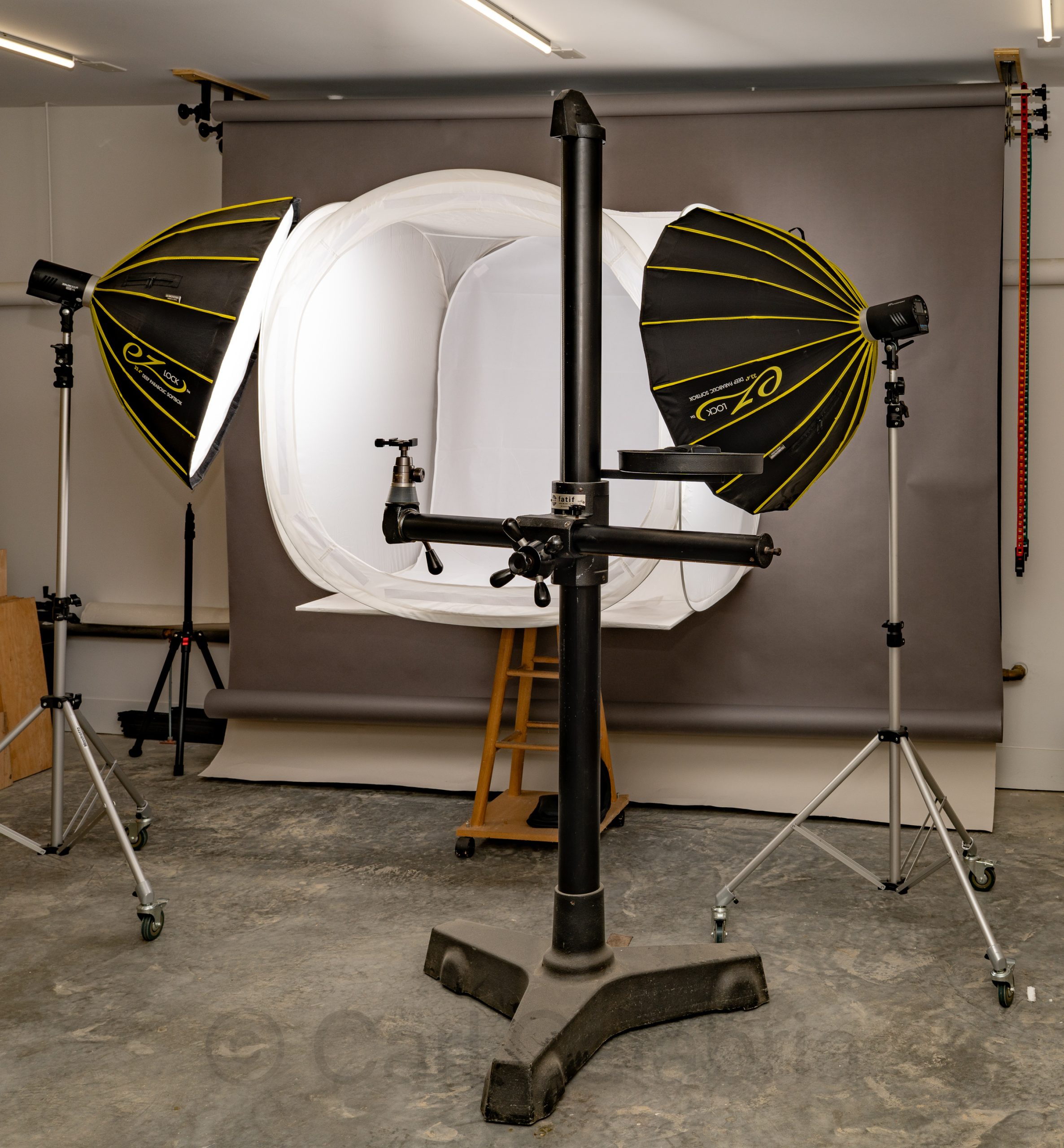 I finally got around to setting up a proper photo studio in the basement today. Most of my time was spent suspending three rolls (grey, while, and black) of background paper from the ceiling. Each roll is 9 feet wide and can be individually raised or lowered with pull chains for quick background color changes. These will be used for portraiture and large product photography. I also mounted a 4’x4′ light tent on a mobility base. In the foreground is my camera stand, which allows me to rapidly position my camera almost anywhere in the studio. Think tripod on a mobile base with an arm that can reach out over things. Two battery-powered strobes with soft boxes complete the all-wireless setup. Slightly more compact than my studio in our last home, it is more than adequate for the type of photography I expect to be doing going forward.