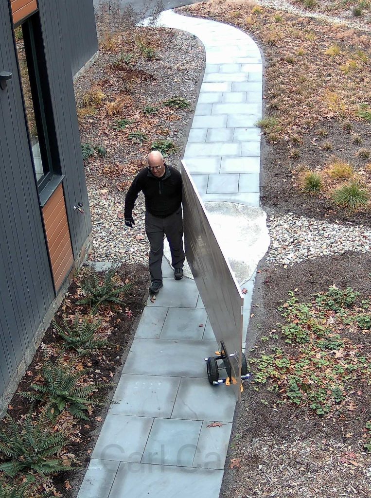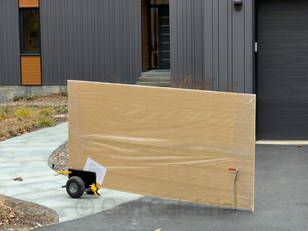 When I was a young man, I could easily carry a 3/4 inch 4×8 foot piece of plywood unassisted. Those days are long gone. Over the winter, I will be building a new desk with drawers for Jeanine’s office and a new bed with integrated nightstands, headboard, and shelving. Moving 12 sheets of bamboo plywood, each weighing ~90 pounds, from the garage to my workshop proved to be quite a demanding job. I used the pictured contraption to move one sheet at a time. The task took the better part of two hours and will take the place of today’s visit to the gym.