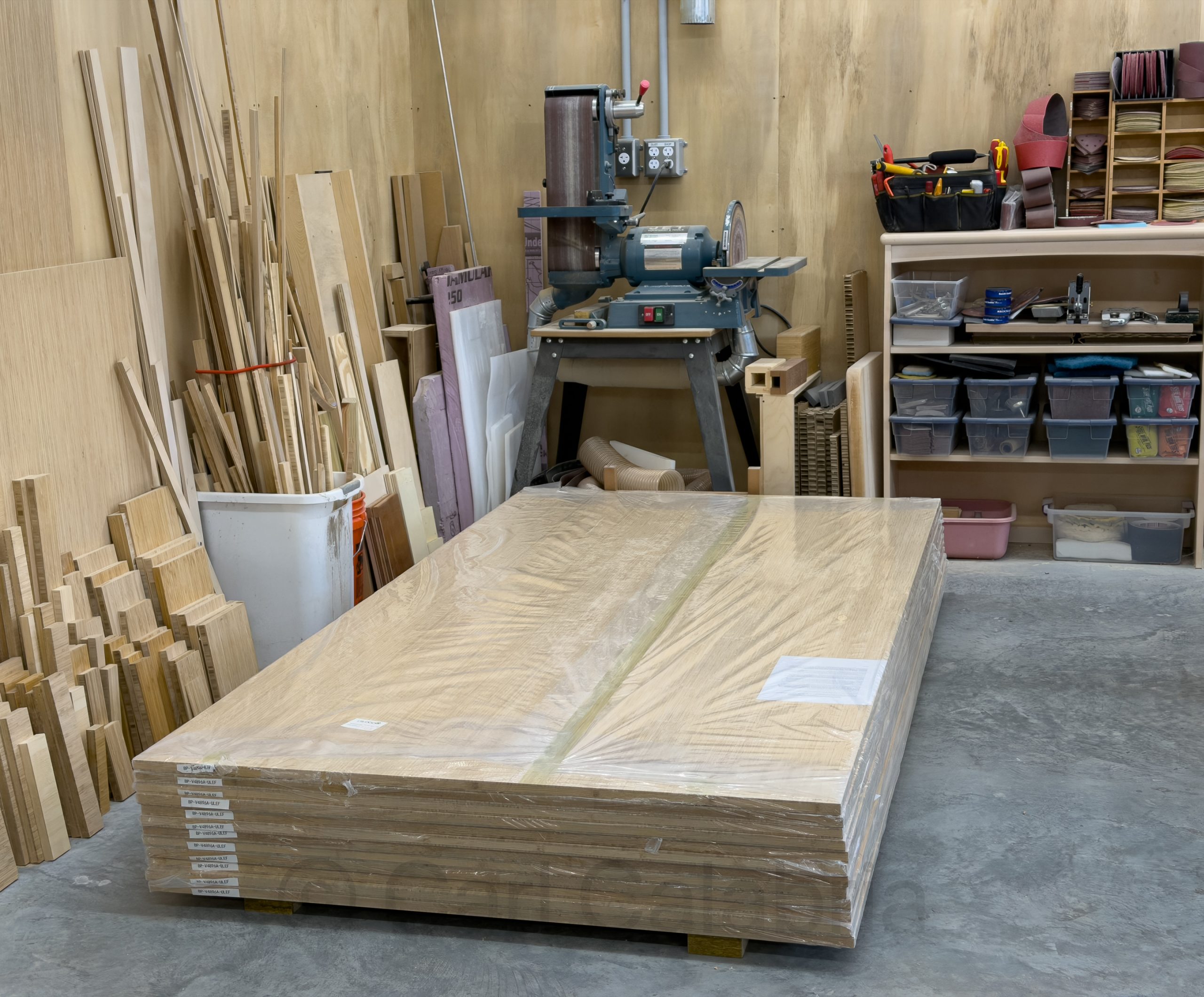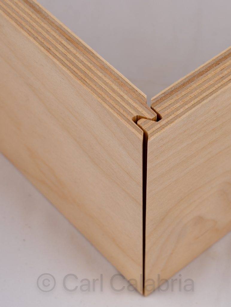 I started the fabrication of 9 additional drawers to add to the 105 I have already built for various cabinets throughout the house. They are, without a doubt, the least satisfying objects to construct, demanding high precision and mindless repetition. Each box requires 6 perfectly-sized parts, a left and right side, the front, and back, made from 5/8″ 11-ply Baltic birch plywood, a bottom made from 3/8″ Baltic birch, and a 3/4″ bamboo drawer face. The box is joined with lock miter joints, which are very strong, easy to assemble, but very sensitive to even small machining errors. Tomorrow, I hope to enlist Jeanine’s assistance to glue up all of the joints. Because the joint profile is so convoluted, it takes time to apply glue to each surface, and all four corners must be mated at the same time. Having a glue buddy makes the process go twice as fast, which is important since the glue starts to set as soon as it is exposed to the air.