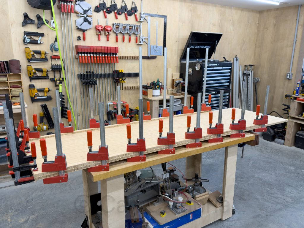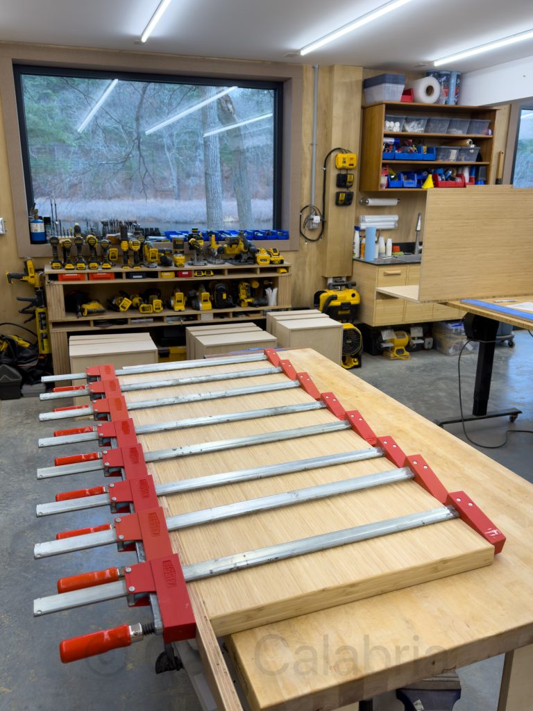 Having used the credenza I originally built for my office to complete the return section of Jeanine’s new desk, I am now working on a replacement. It is about 1/3 larger than the original, and I think the proportions work much better as a standalone piece of furniture. I hope to have the full carcass assembled and finished before tomorrow, so I can take advantage of the extra hands that will be available to help me move it into my office. I enjoy building things out of bamboo because I love the appearance and the fact that it can grow back so quickly. A new shoot can reach its full height in about two to three months, and some can grow up to 35 inches a day under ideal conditions. Not only is it renewable, but it is also extremely durable. No building material is perfect, however, and the disadvantage of building with bamboo is how heavy it is and how quickly it dulls even the toughest carbide blades. I estimate the finished credenza will weigh in excess of 200 pounds. It is both a relief and sobering to realize that it will never be moved again in my lifetime.
