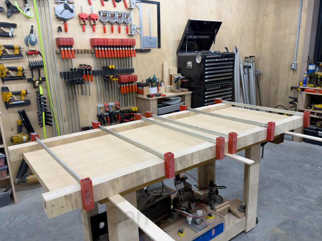 Jeanine is visiting a friend on Martha’s Vineyard for the weekend. I am hoping to surprise her with a completed desk for her office when she returns on Monday. It is an ambitious goal that may be thwarted by the late delivery of drawer hardware. Nonetheless, I set out in earnest this morning. Pictured here is the primary desktop under construction. An “L” shaped return will be provided by a double-wide filing cabinet. Initially, I had planned to make the desk a “built-in” by attaching it to the wall. This would have saved a bit of the very expensive bamboo plywood at the cost of future flexibility and ease of installation. In addition to the top, I completed the three-drawer cabinet that will support the left side of the desk. Tomorrow, I plan to tackle the bookshelf that will support the right side and also apply the finish.