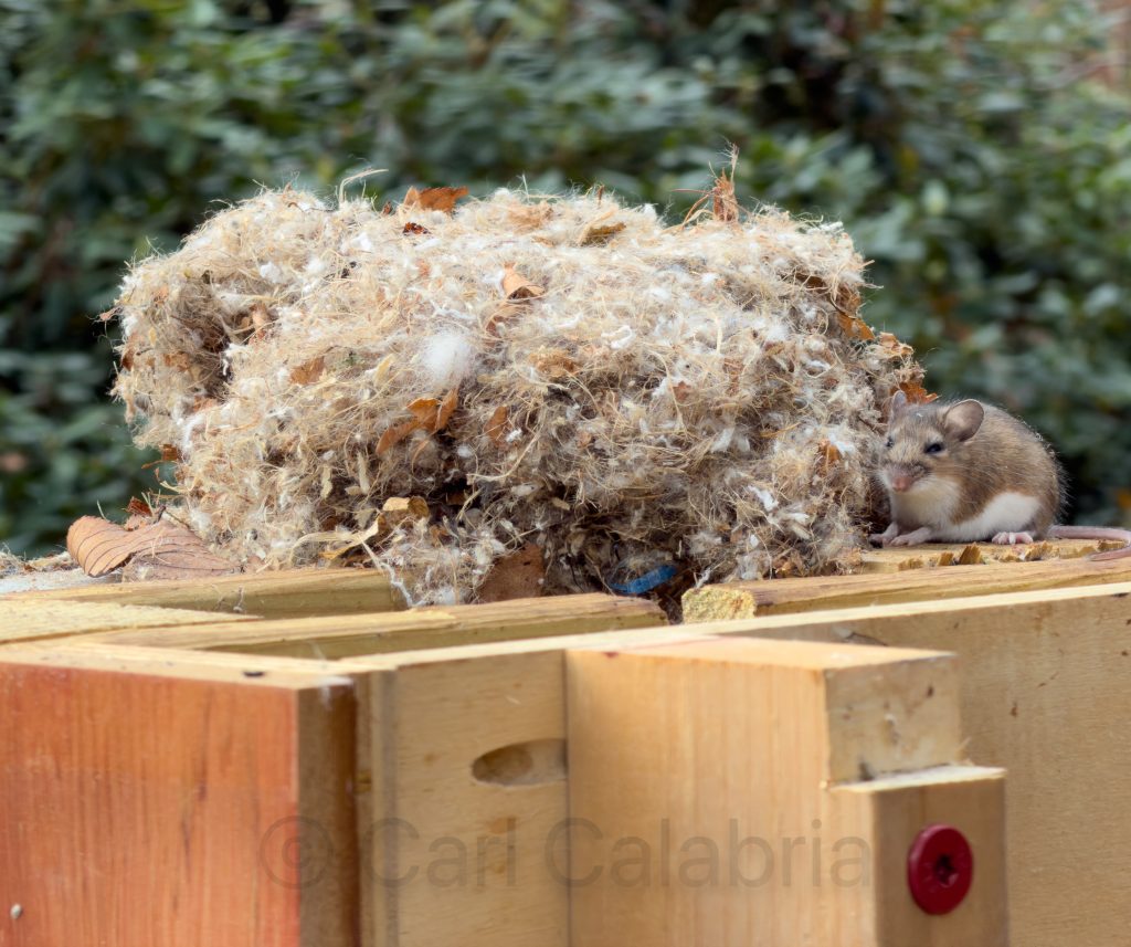 Now to the mice. For the last week or so, our driveway sensor has been giving false notifications. The infrared sensor is located on the pedestal, which supports our electric power meter and a pair of security cameras. I decided to pull the cap off to examine the wiring for possible issues. What I discovered was a mouse hotel. Two guests made a sprint for the forest while a half dozen remained in their cozy quarters. I pushed the woolly mass into a deep 5-gallon bucket, where they now remain under house arrest while I figure out what to do with them.