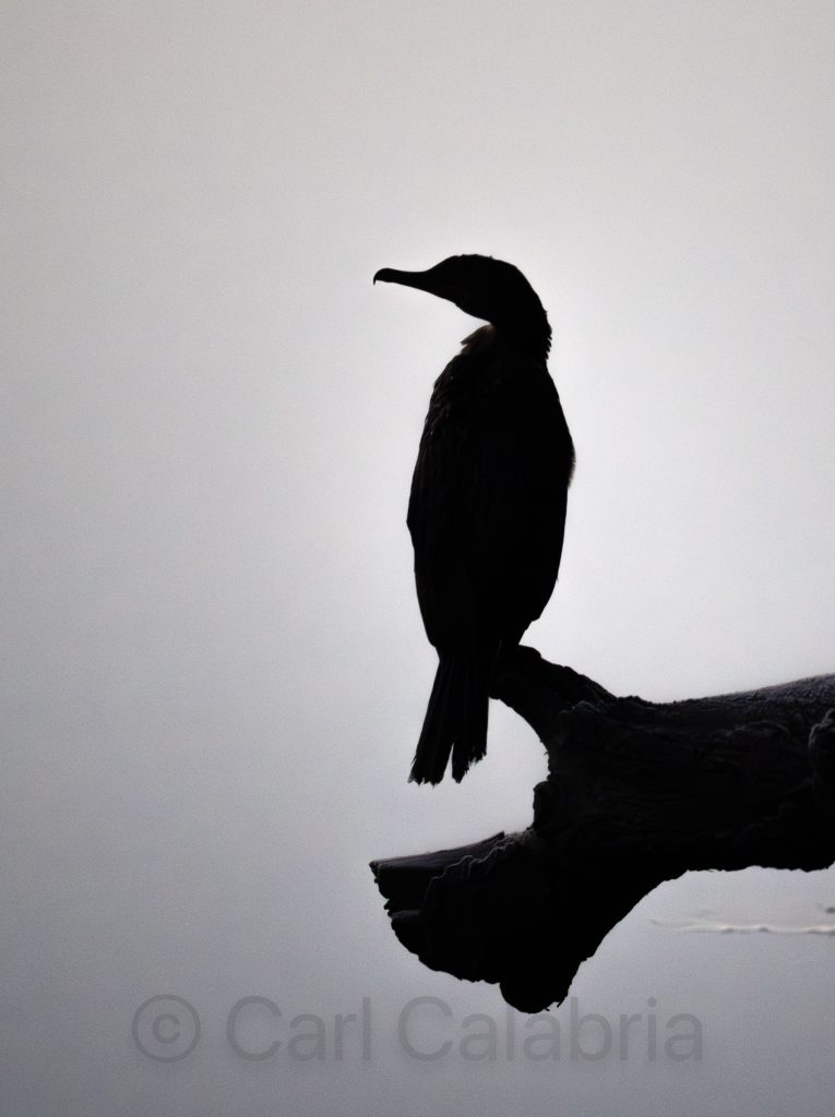 Also of interest on the river this morning was a cormorant perched just above the water. I under-exposed to capture a silhouette, and I really like the composition.