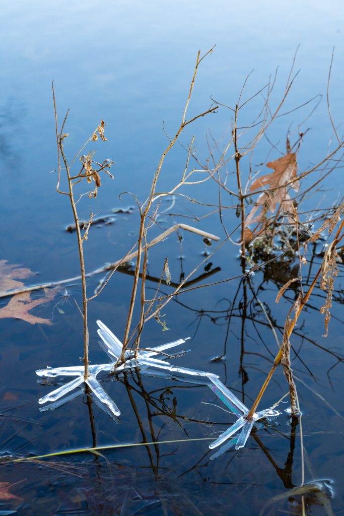 After a heavy rain, the river rises only to fall several hours later. If this coincides with an overnight drop in temperature, it is possible to wake up to “ice petals”. These frozen structures suspended just above the water are supported by plant stalks or tree trunks. They can range in size from a few inches to nearly a foot, depending on the diameter of the scaffolding.