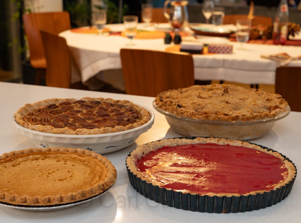 Despite the chilly weather, I was able to coax an outdoor family portrait with the full crew during a break from food preparation. In a departure from tradition, we ordered a boneless turkey breast rather than the whole bird. Even more unusual, I was charged with cooking it, possibly due to my knowledge of the steam-cooking options on our oven. It should be noted that I have never in the course of my life cooked a turkey, or chicken, or pigeon, for that matter. Undaunted by my assignment and aided by temperature monitoring probes and several YouTube tutorials, I will give myself a B+ for the effort.
