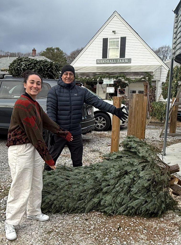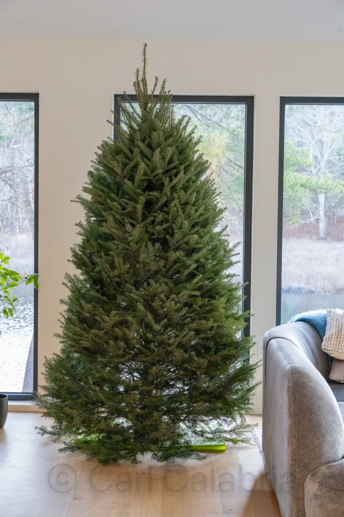 The hunt for a Christmas tree was the order of business this morning. Maya, having forgone all manner of warm clothing, was quick to identify a candidate. Kyle deemed it too skinny and continued the search. Just about the time Jeanine joined us after her workout at the gym, Kyle declared victory, and all parties concurred with his choice. It proved to be the perfect height and width for our space, as confirmed once in situ.