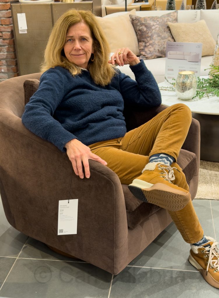 Later in the day, Jeanine and I went hunting for a far more elusive item—the perfect reading chair for her office. Her fanny sampled dozens of options in three different stores. She has narrowed the possibilities to a handful and will return to her favorites tomorrow to evaluate fabric options.