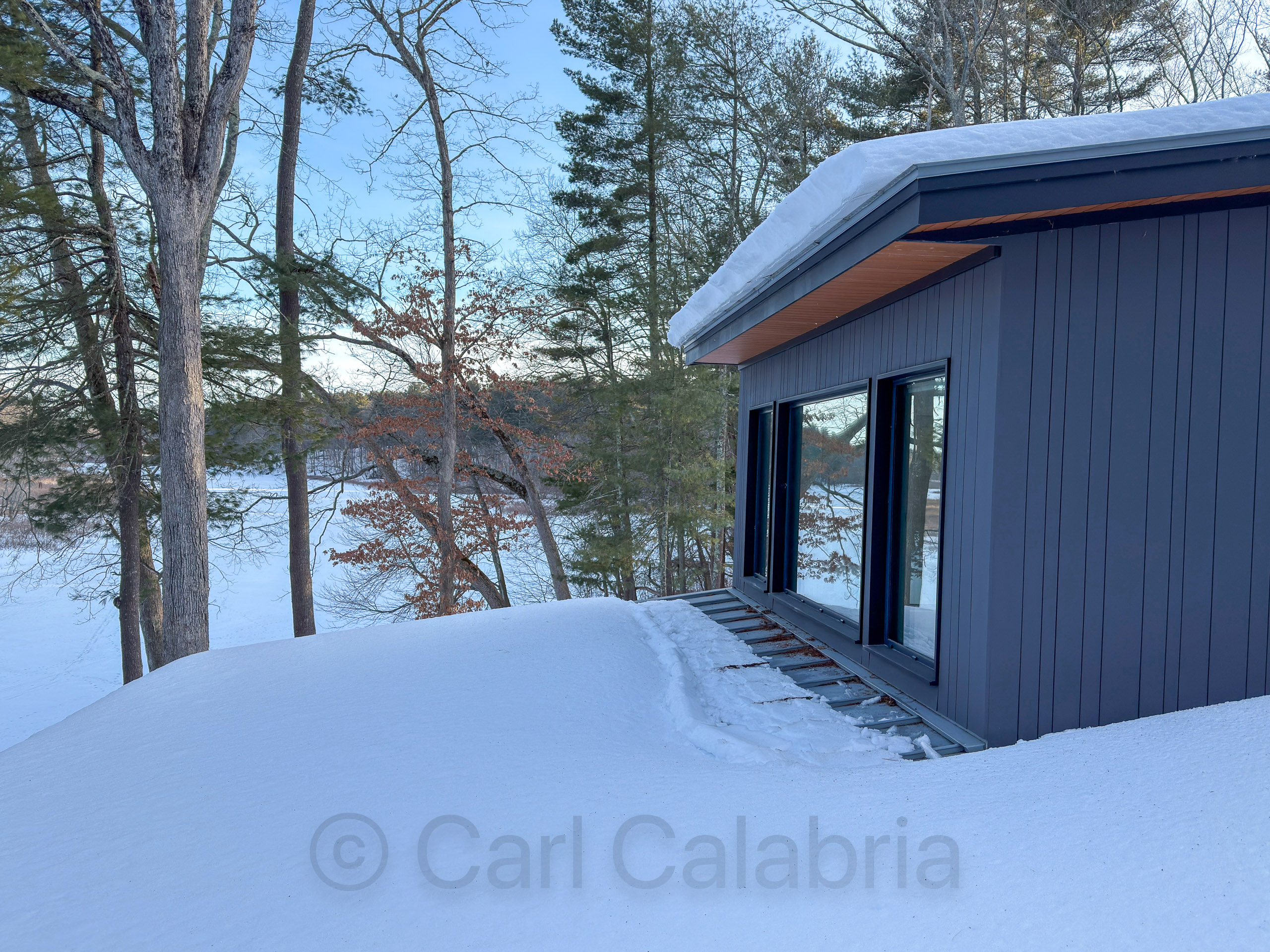 Jeanine noticed from the windows of her sanctuary that the roof vent for our cooktop had been dislodged by the ever-so-slowly (think glacially) advancing sheet of snow sliding off the roof. If snow or rain were allowed to enter the exposed exhaust pipe, water would drip down onto our cooktop and potentially damage the fan motor. I decided that an immediate repair was called for. I must admit that the idea of climbing a 20-foot ladder onto an icy and snow-covered metal roof in below-freezing temperatures was not something I was looking forward to in the least. Even so, postponing was not an option. I made one trip up the ladder to assess the situation and a second to return with the necessary tools and hardware to complete the repair. When I completed the work, I decided to take a picture of the river from the rooftop. It did not occur to me to take a picture of the repaired roof vent until I was back on the ground, and at that point, the risk of a third trip up the ladder seemed like a bad idea.